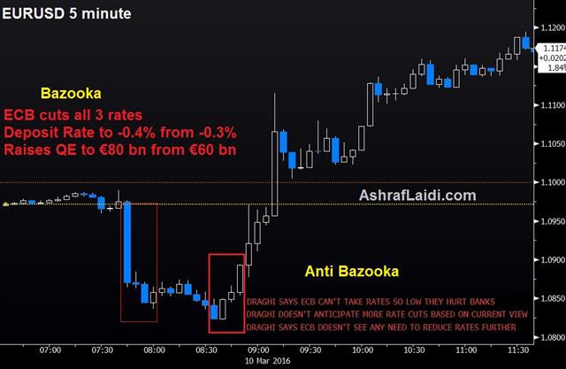 How far down would the euro have gone had Draghi not dampened expectations on further ECB action? Does that matter? The fact that the euro unleashed one of its biggest gains despite the record expansion of asset purchases of Eurozone debt to EUR 80 bn per month from EUR 60 bn and reducing all 3 interest rates, including the reduction of the deposit rate to a record low -0.4% from -0.3% speaks volumes about the efficacy of negative interest rates.