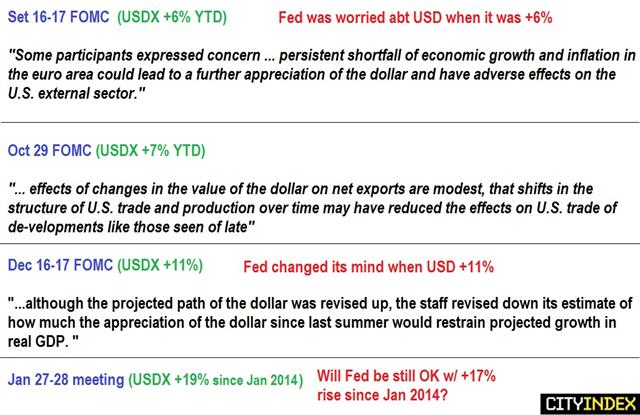 USD rallied against all FX with the exception of the Japanese yen-- the overall winner following today's release of the FOMC statement, which can be best summed up as less dovish than expected, or slightly more hawkish than anticipated. The resulting declines in the stock market – 195 pt loss in the Dow meant a 2.75% decline in two days, which is the biggest back-to back drop since February 2014. Full charts & analysis.