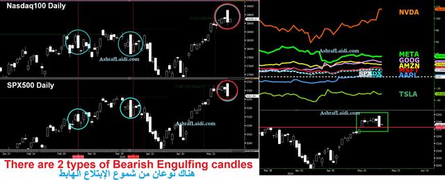 The left-hand side chart below shows bearish engulfing candles on the Daily Nasdaq100 and SPX500. Yesterday's case followed a down-candle, which usually has more bearish implications than in cases where the prior candle is an up candle, as seen in prior two cases (circled in blue). It may take as many as 2 or 3 days before the next drop emerges.