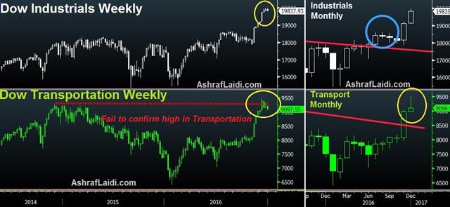 Besides the better known Dow Jones Industrials Index, which consists of 30 companies, the less familiar Dow Jones Transportation Index consists of 20 companies, mostly related with transportation, rail, shipping and cargo companies. The divergence between the Dow Transportation Index and the Dow Industrials Index continues to deepen. The Transportation index failed to continue closing at new highs at a time when the Industrials index has closed at new record highs for 6 consecutive weeks. Not only has the Transportation index stalled, but began to drop lower, while the business media is busy focusing on when will the Industrials hit the purely symbolic 20,000 landmark.
